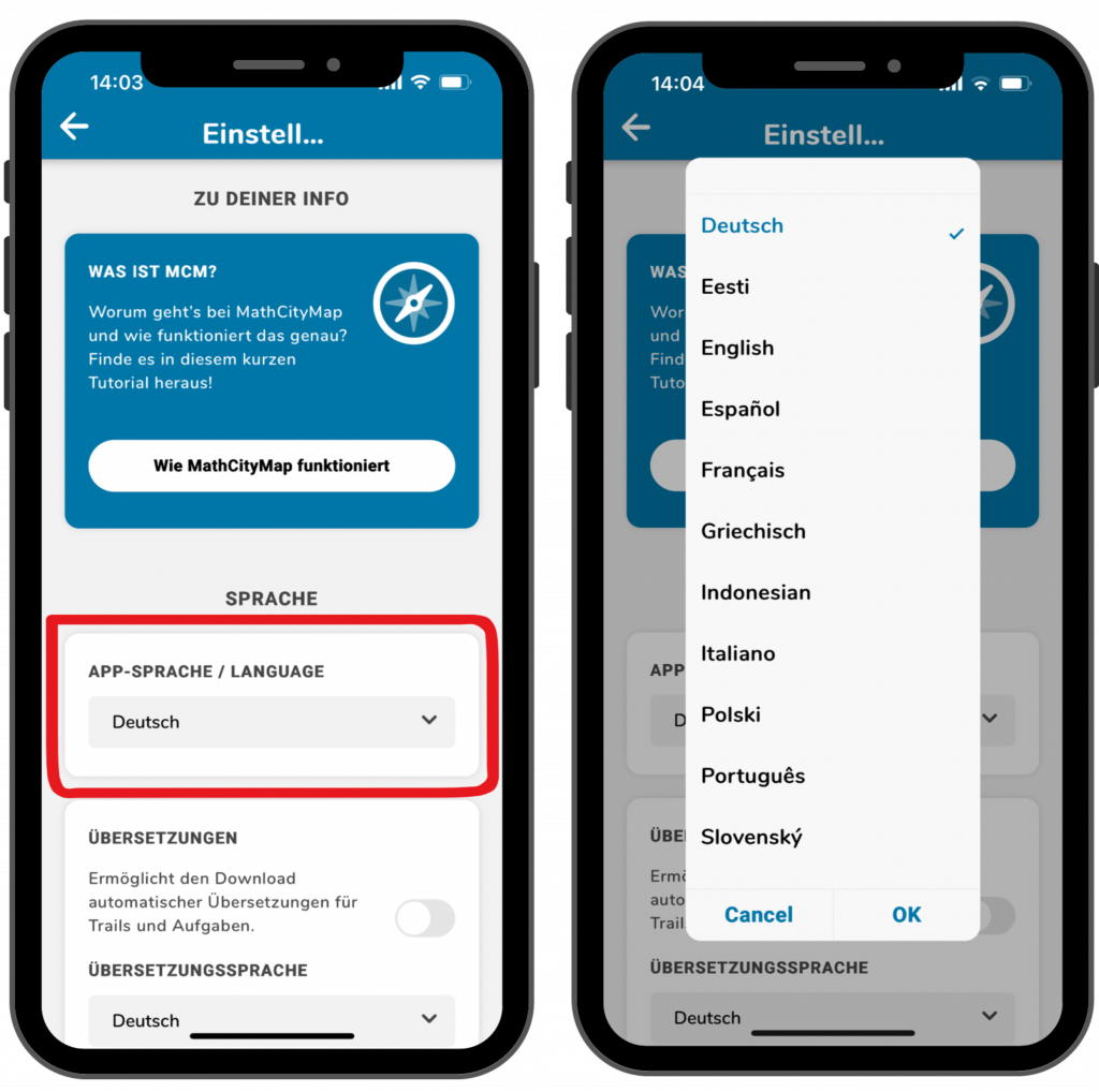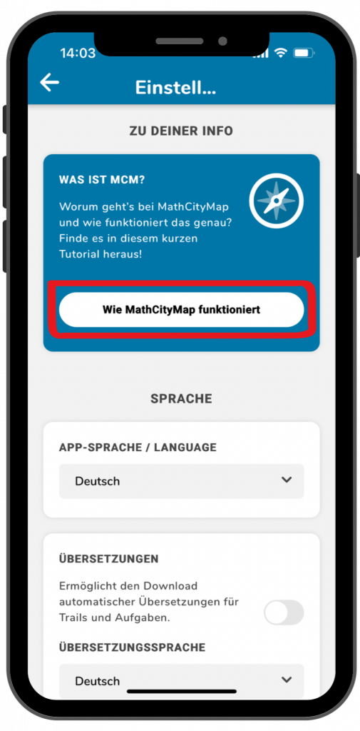 Die Einstellungen helfen dir bei einer optimalen Nutzung der MathCityMap App. Hier sind ein paar Schritte zu verschiedenen Einstellungen: