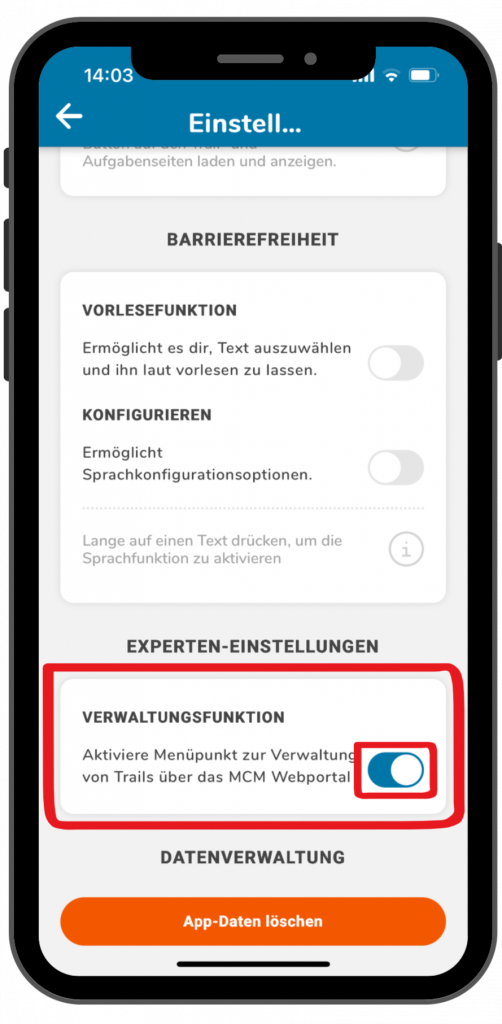 Falls du das MathCityMap Webportal auch über die App nutzen und dadurch deine Trails verwalten möchtest, musst du den Regler bei „Verwaltungsfunktionen“ aktivieren.