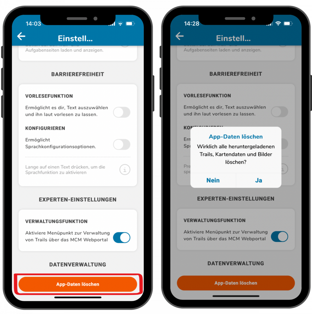 Dadurch wird die App wieder auf die Grundeinstellungen zurückgesetzt, es werden alle gespeicherten Trails, Kartendaten und Bilder gelöscht.