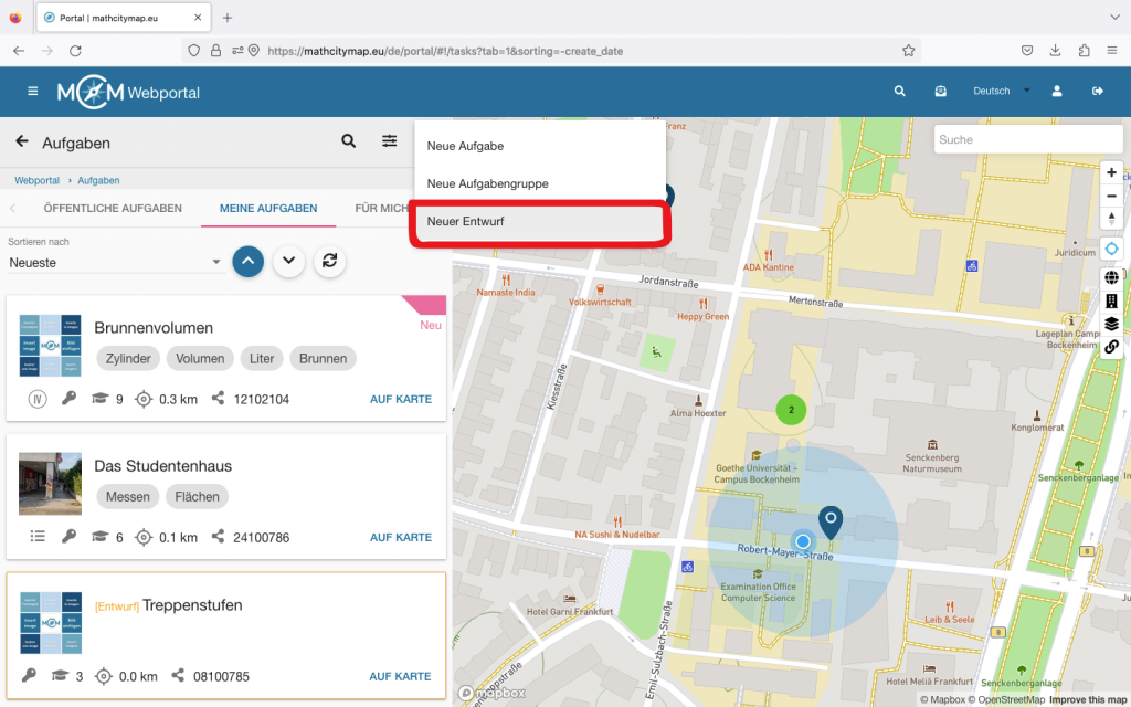 Gehe auf „Aufgaben – Anlegen und Verwalten“ oder wähle „Aufgaben“ in der Menüleiste auf der linken Seite.