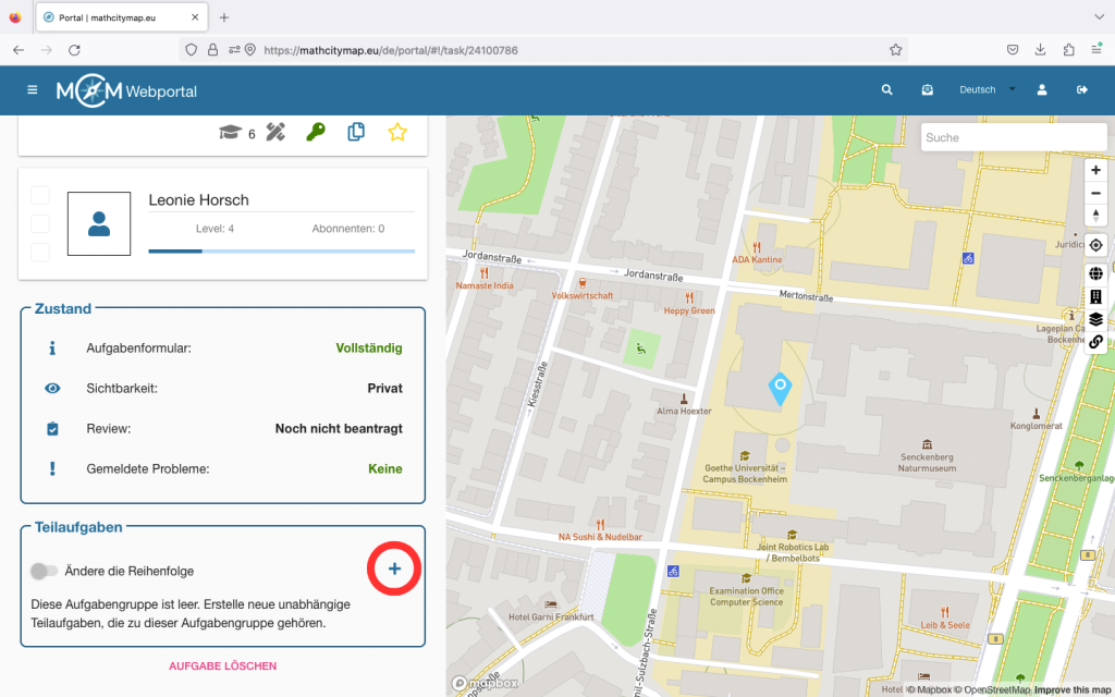 Wenn du auf deine Aufgabengruppe klickst und nach ganz unten scrollst, kommst du zum Abschnitt „Teilaufgaben“. Klicke auf das Plus-Symbol, um weitere Teilaufgaben zu deiner Aufgabengruppe hinzuzufügen.