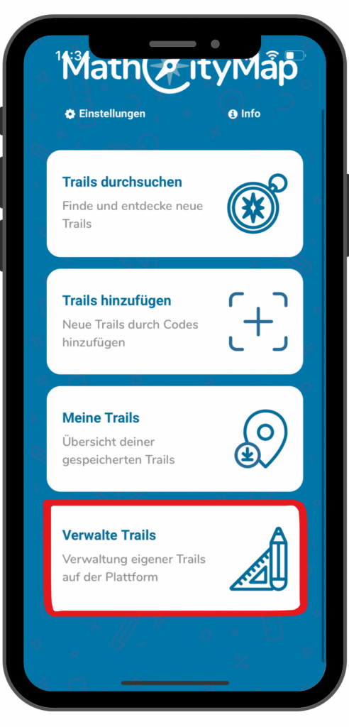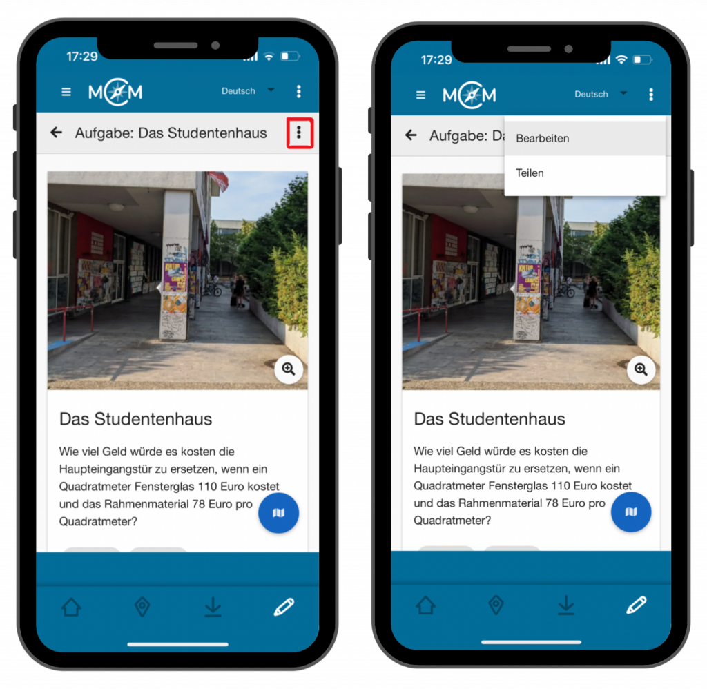 Im Unterschied zur Nutzung des Webportals am Tablet oder am Laptop im Browser, findest du die verschiedenen Verwaltungsmöglichkeiten zu deinen Inhalten unter den drei Punkten oben links, wenn du eine Aufgabe, einen Trail oder eine Gruppe angeklickt hast.