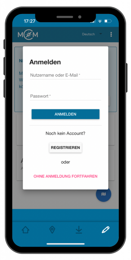 Du kannst auch ohne Anmeldung fortfahren, jedoch kannst du dann nicht alle Funktionen des Portals nutzen.