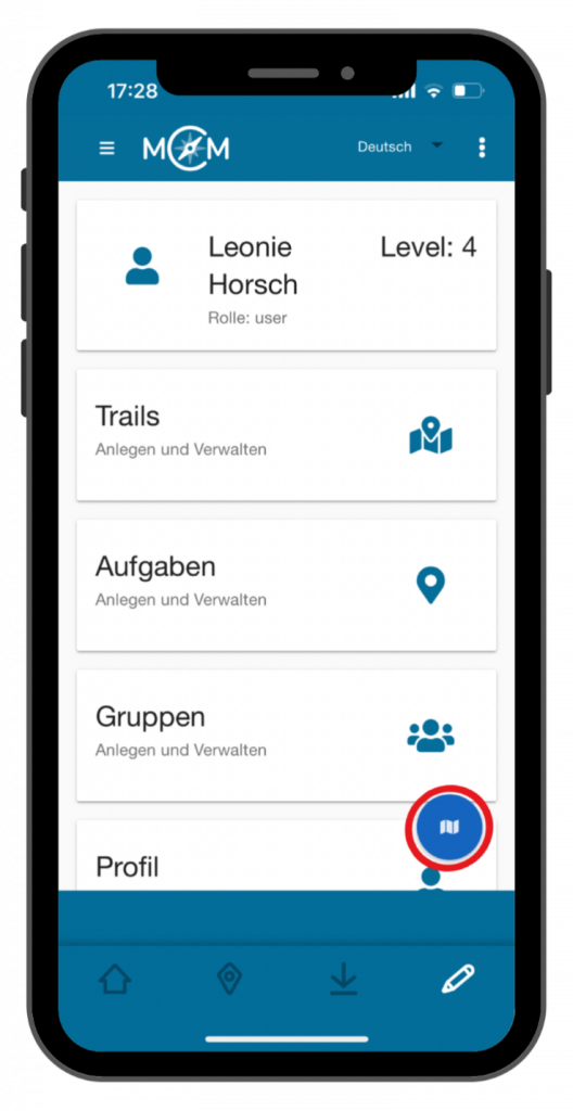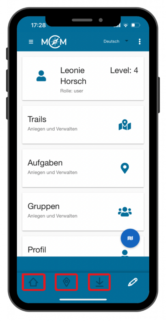 Das Haus-Symbol steht für die Startseite der App, das Standort-Symbol für die Suche von Trails und das Herunterladen-Symbol für deine gespeicherten Trails.